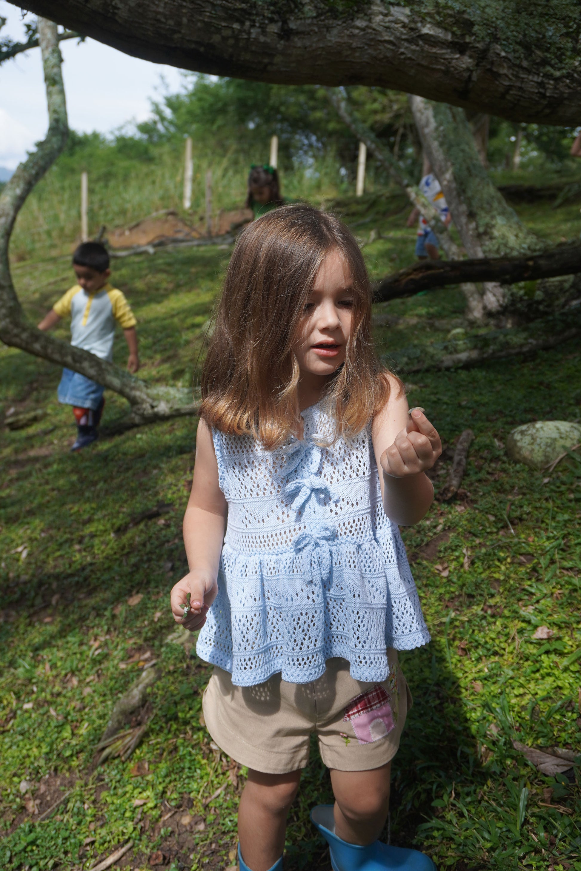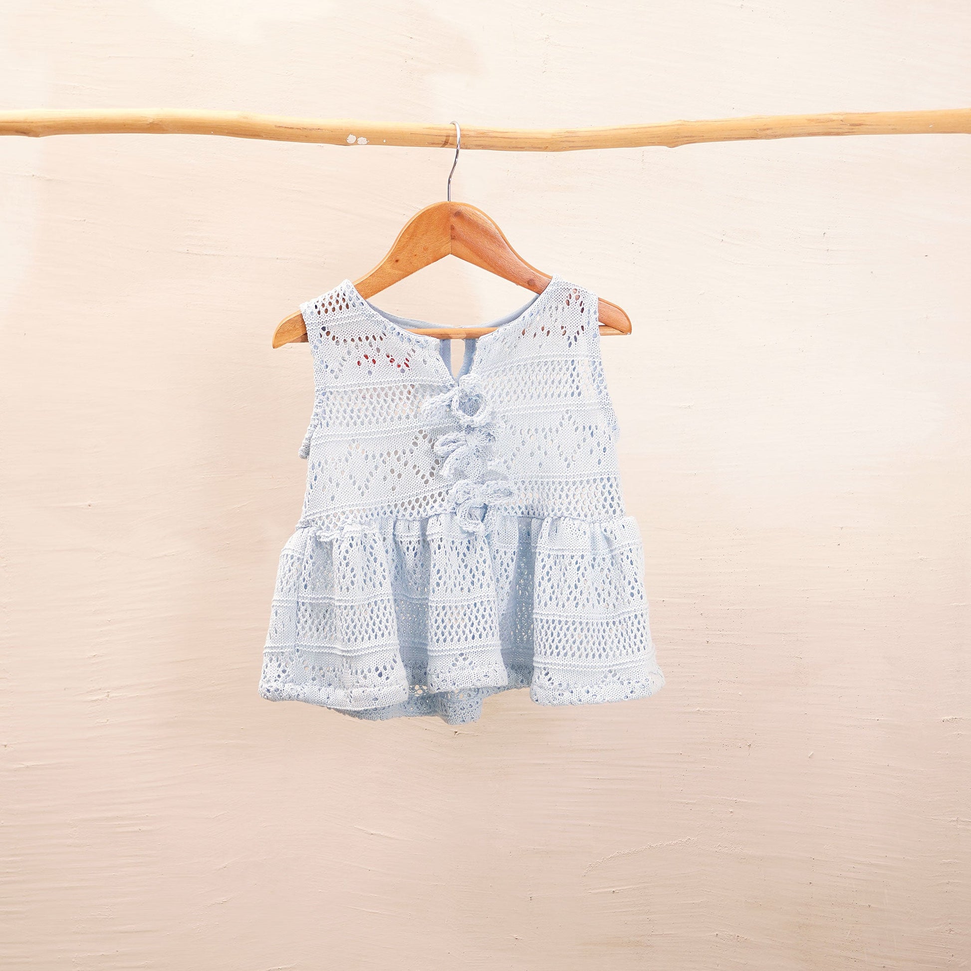 Una prenda ligera como una nube para tu pequeña. Esta blusa en delicado ojalillo tejido de algodón es pura magia. Su color celeste y su textura única evocan días de sol y brisa. Confeccionada con amor para niñas que brillan con luz propia. ¡Tan encantadora como cómoda!