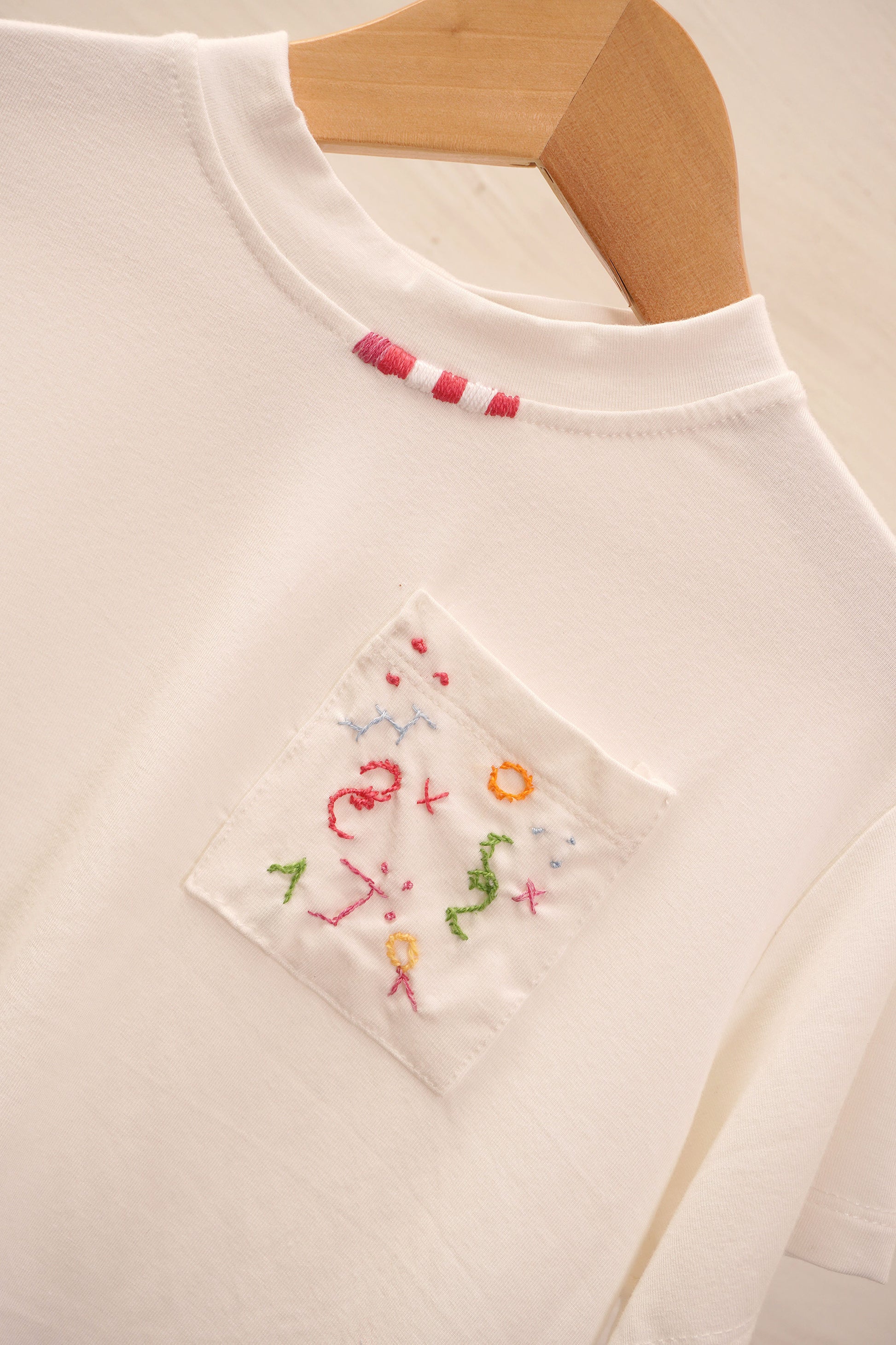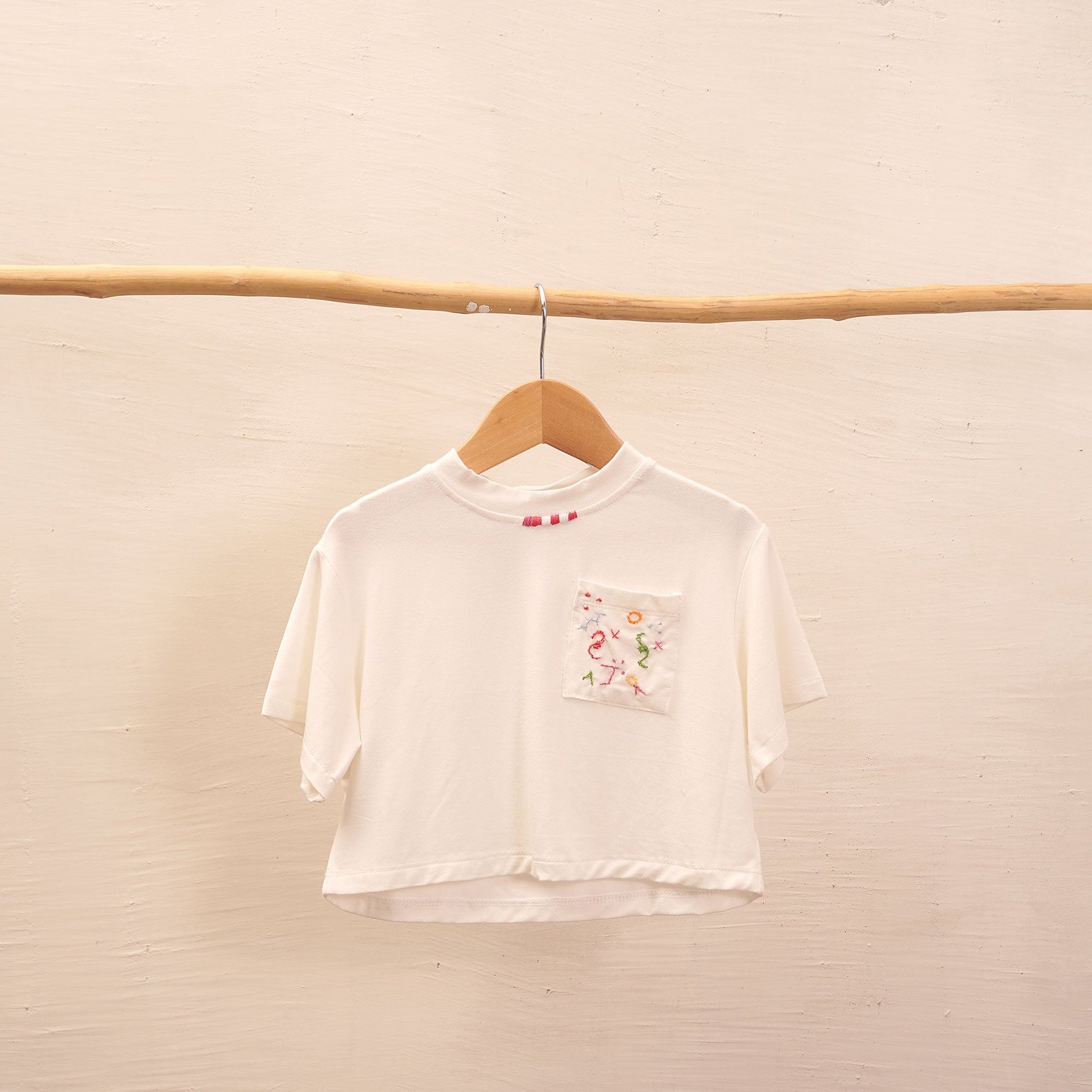 A basic with a lot of personality for sunny days. This crop top in soft white cotton is light and comfortable. Its design is enhanced by a hand-embroidered front pocket that gives it a special and unique touch. Pair it with anything to create sweet, free, and energetic looks.