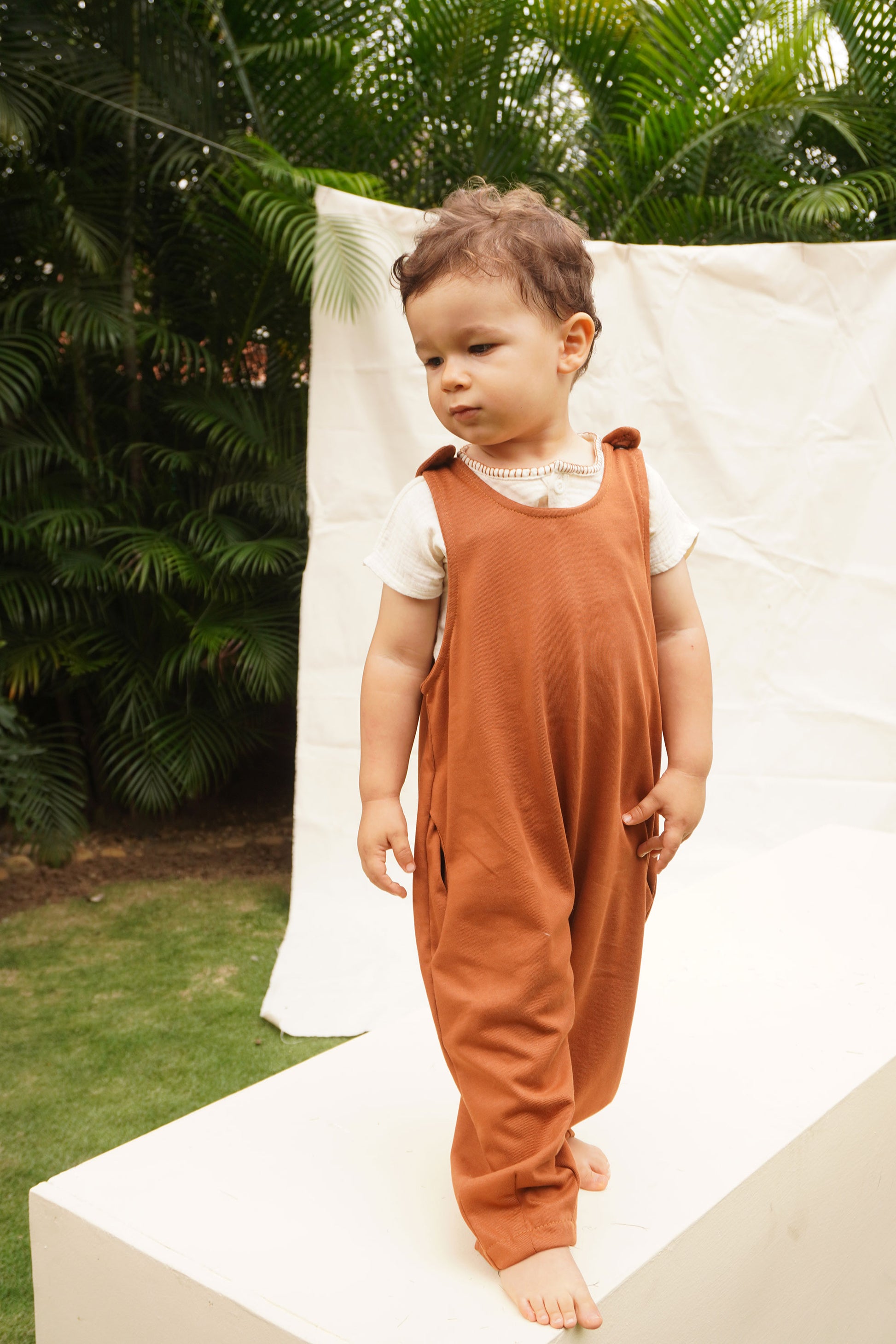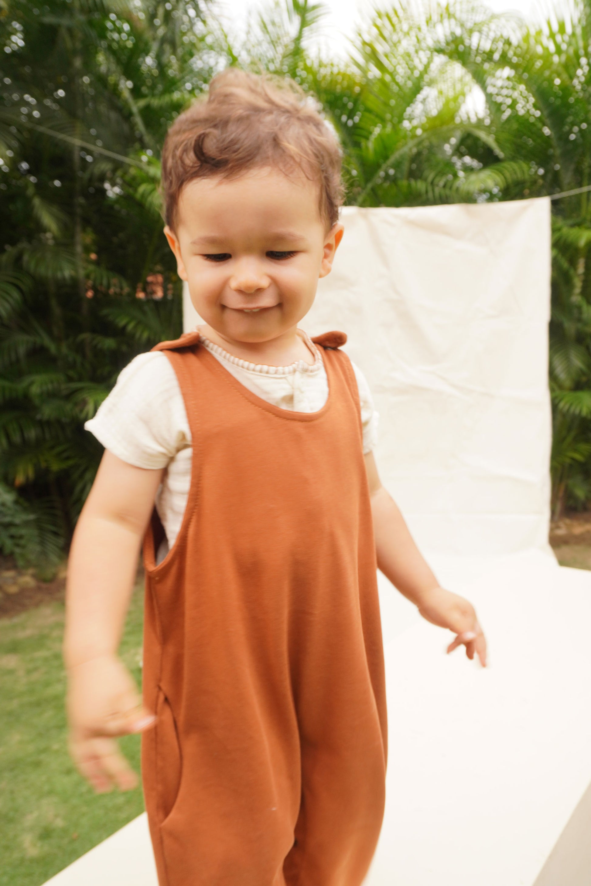 ¡Un clásico renovado para exploradores! Nuestro jumper en vibrante terracota 100% algodón es pura libertad. Su diseño sin mangas y con botones en los hombros lo hace súper fácil de usar, mientras su corte holgado tipo "bombacho" invita al juego y la aventura. ¡Cómodo, fresco y con alma libre!