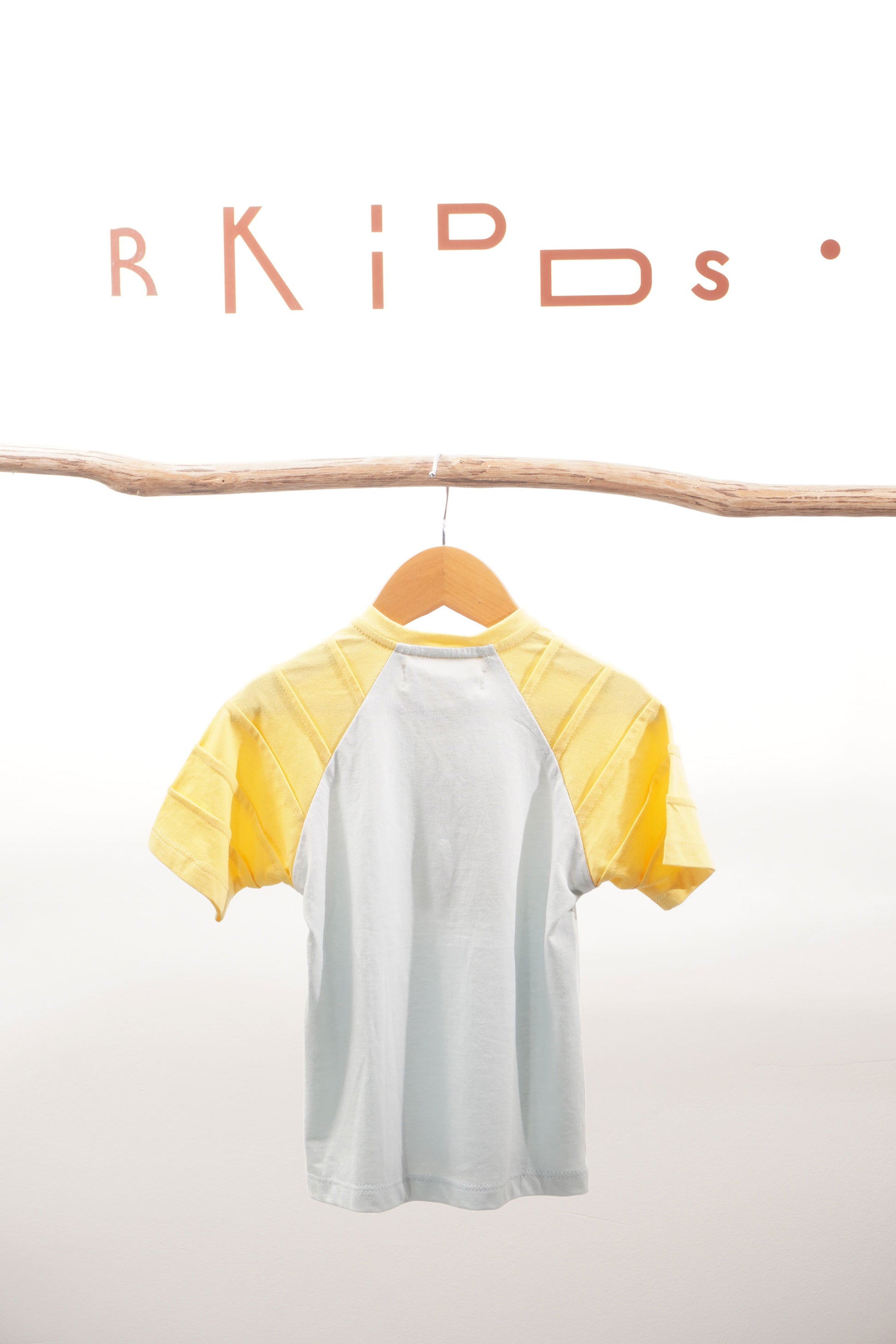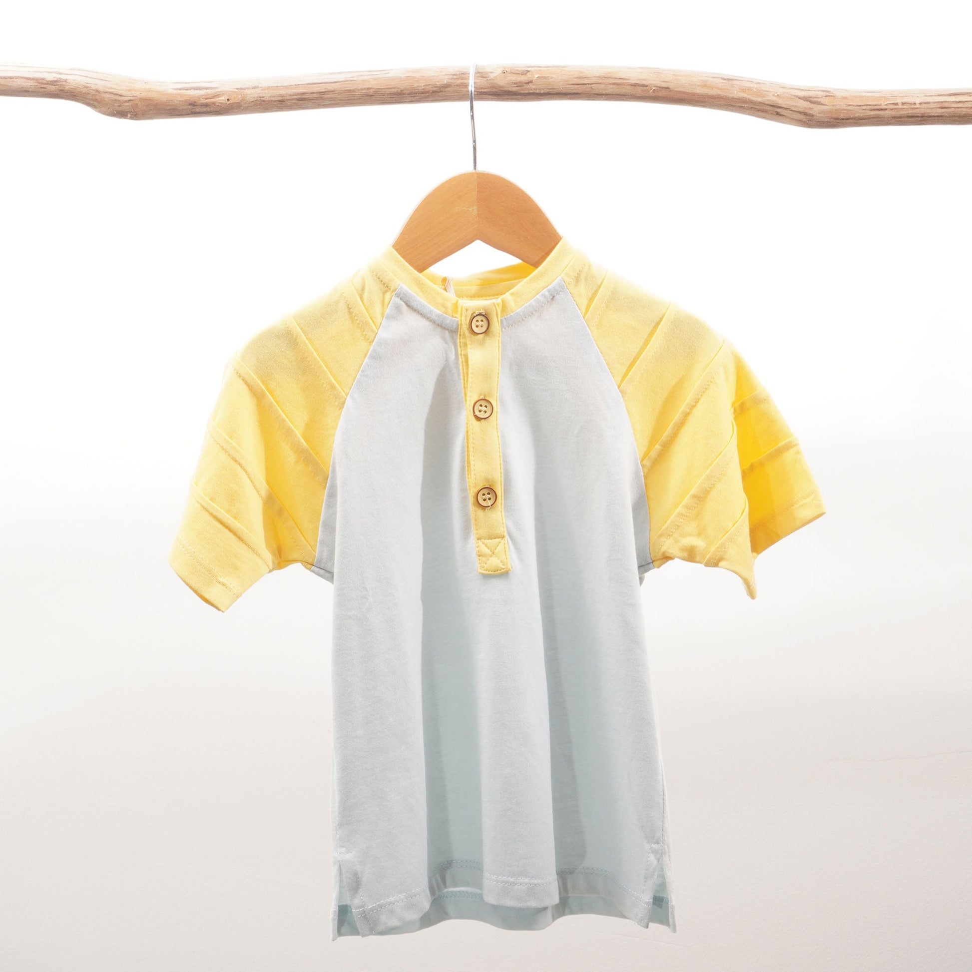 Inspired by baseball, we designed this t-shirt with sleeves featuring a unique tuck effect. Its fun colors, sky blue and yellow, are easy to mix and match. Our t-shirts are made from 100% organic Pima cotton, ensuring no chemicals touch your child's skin.