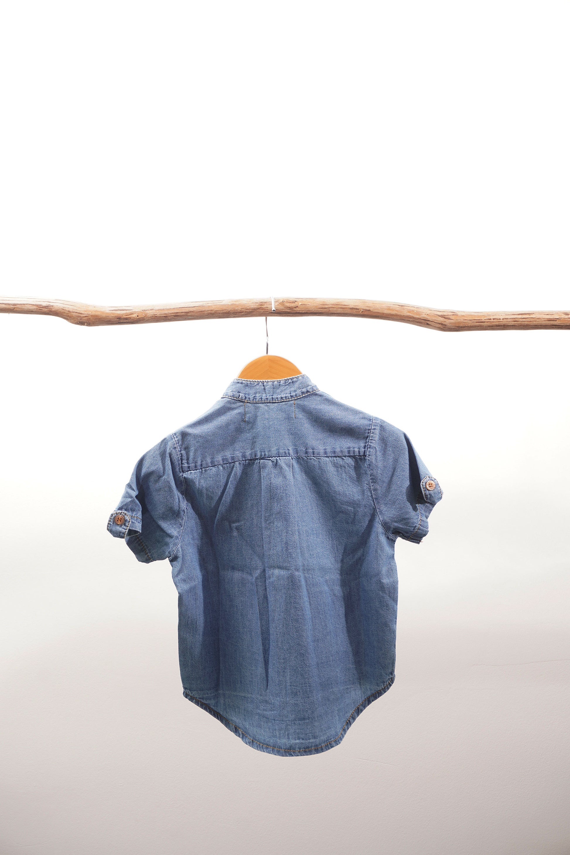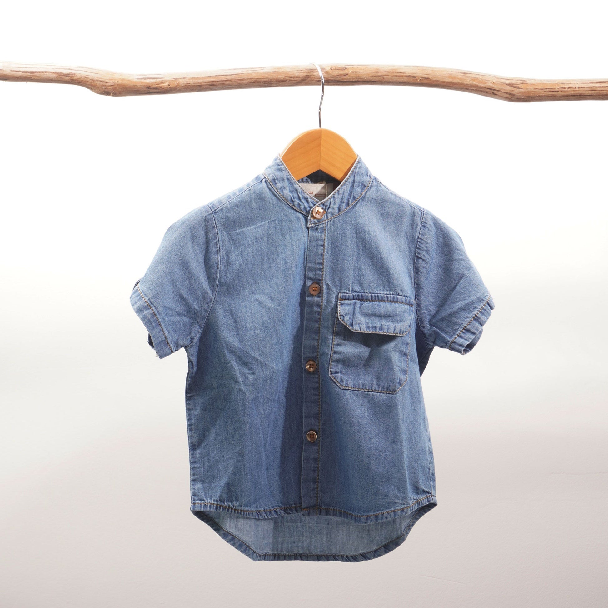 "For the little ones with their own cool vibe! Our Jean Shirt is all about soft denim with a super modern Mao collar and natural wood buttons. It's a relaxed classic with a unique style that's totally timeless