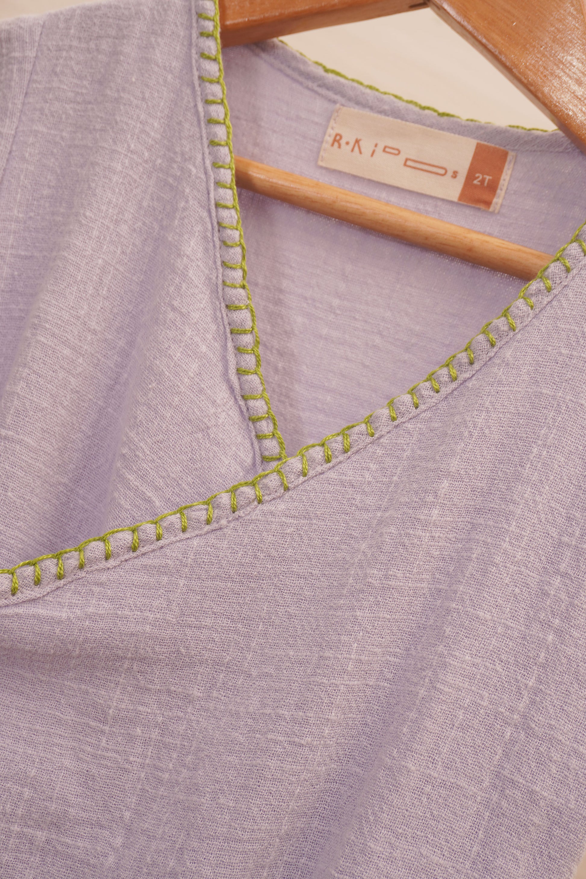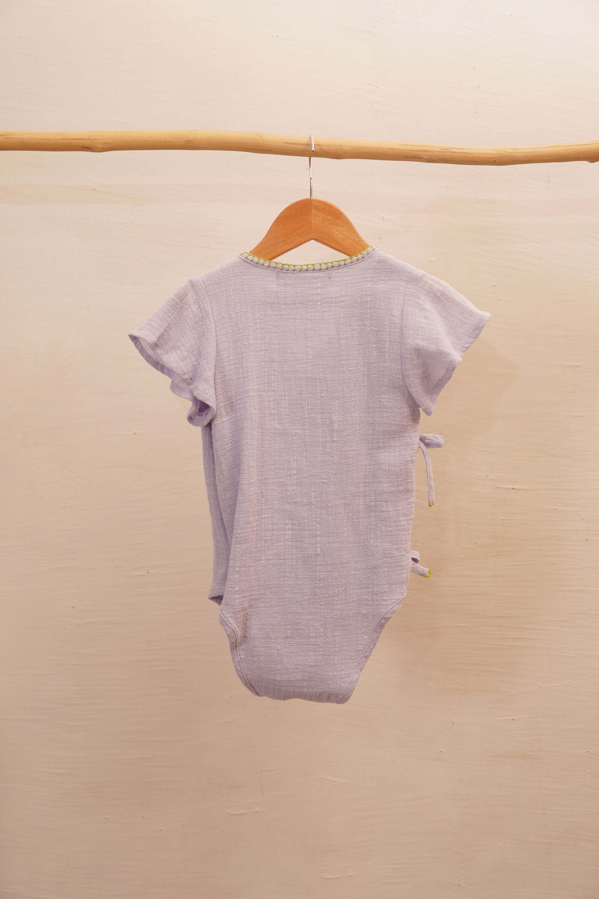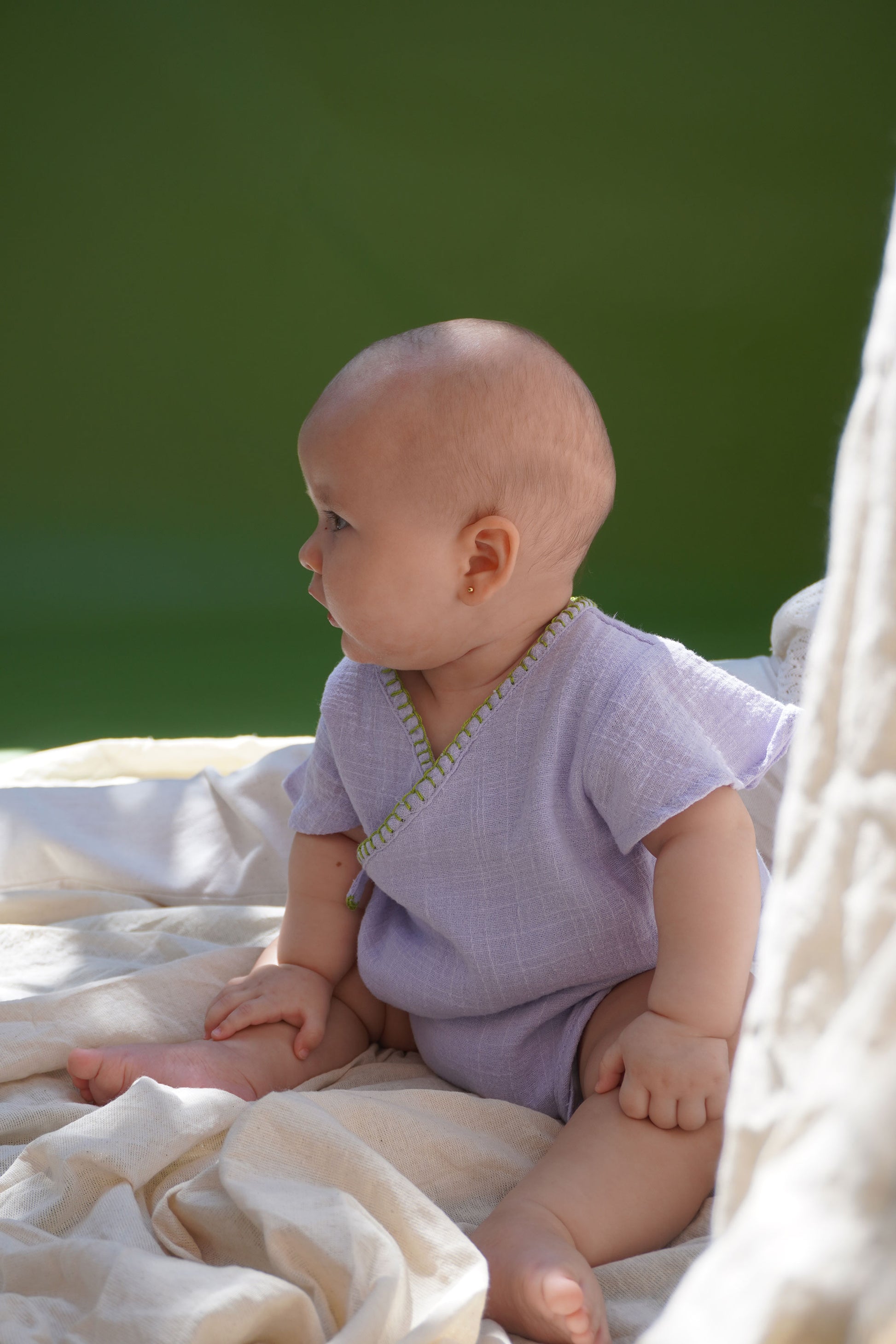 A touch of sweetness and tradition for your baby! This charming kimono, in soft 100% cotton lilac gauze, is pure comfort. Inspired by Japanese Sashiko art, its green embroidered edges add a unique and special touch. Perfect for wrapping your little one in love and style, like a sweet dream!