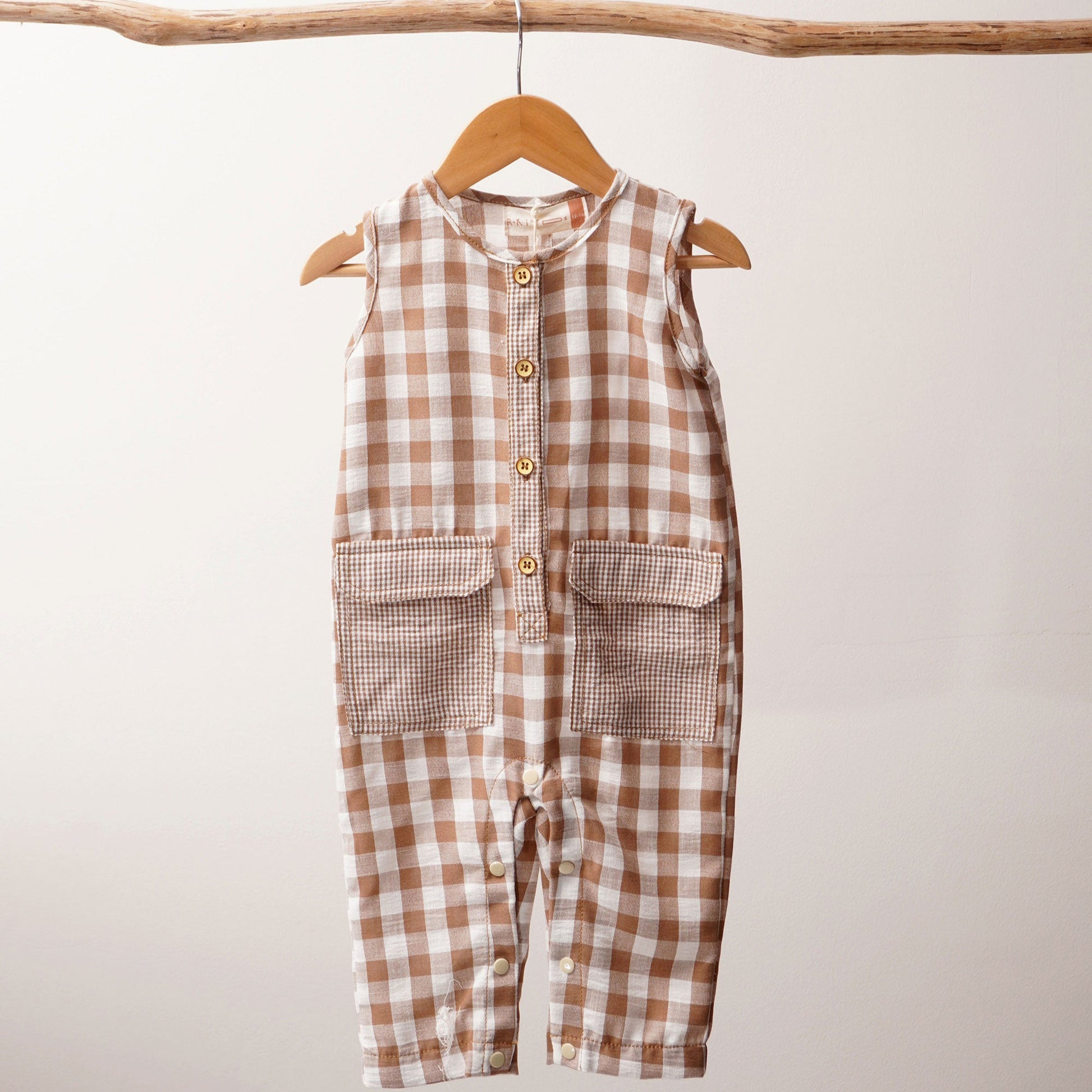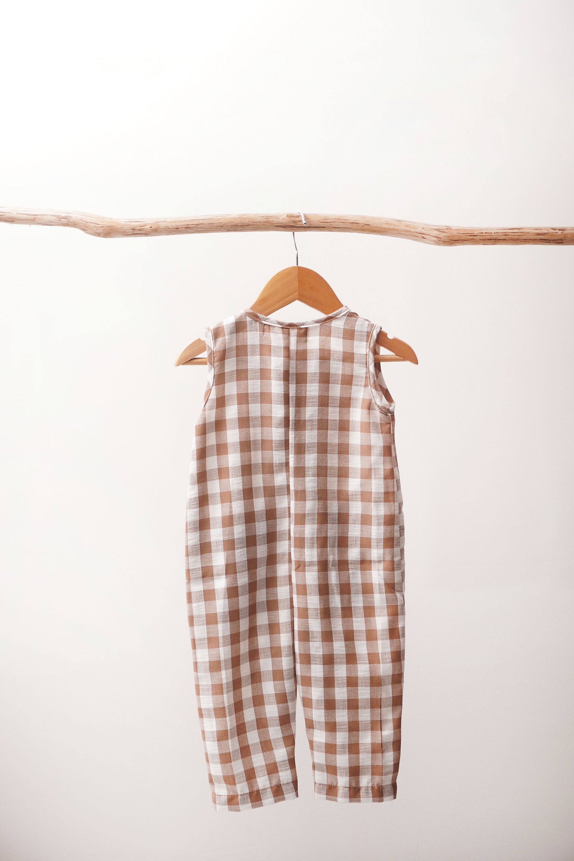 Linen jumpsuit with a charming checkered design in brown and white—the perfect mix of style and comfort. Soft and fresh, featuring practical front buttons and functional pockets, ideal for playful days and endless smiles in style.