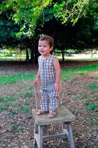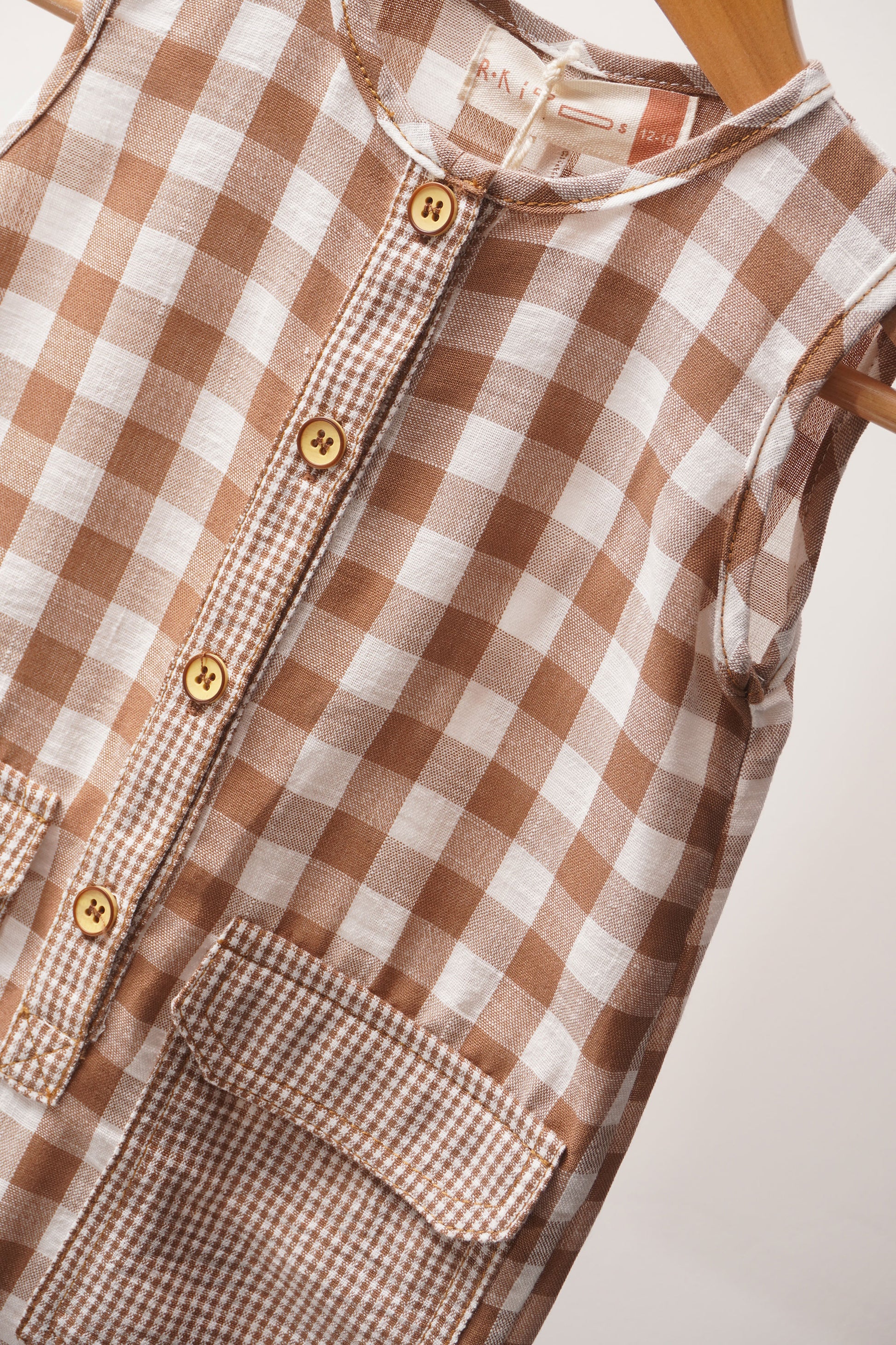 Enterizo en lino con un encantador diseño de cuadros en café y blanco, la combinación perfecta de estilo y comodidad. Suavidad y frescura en una prenda con prácticos botones delanteros y bolsillos funcionales, ideal para días de juego y sonrisas con mucho estilo.