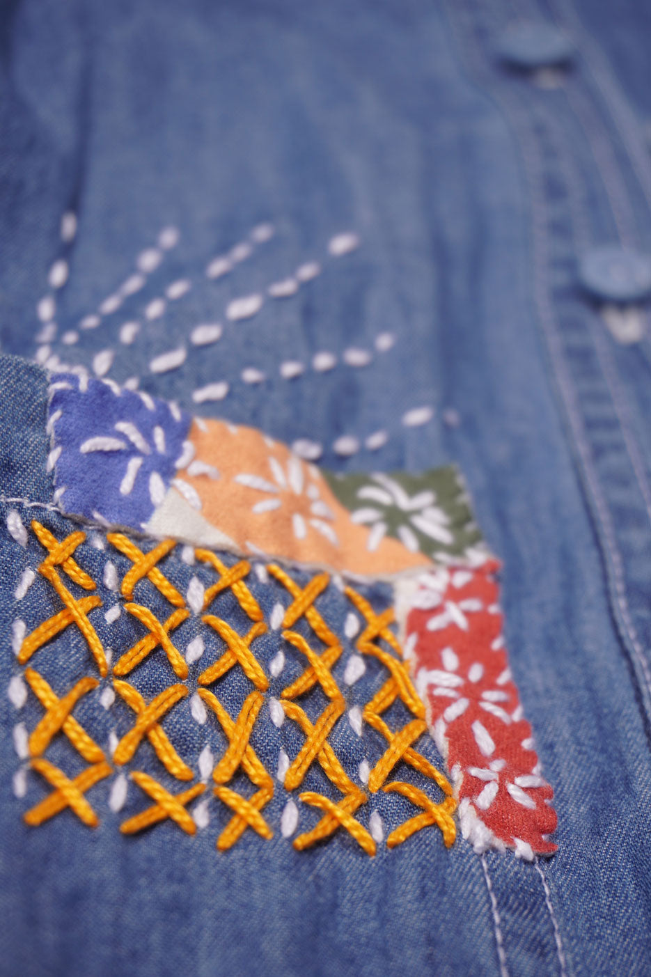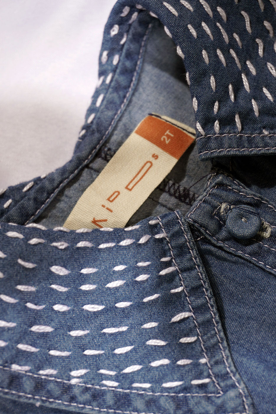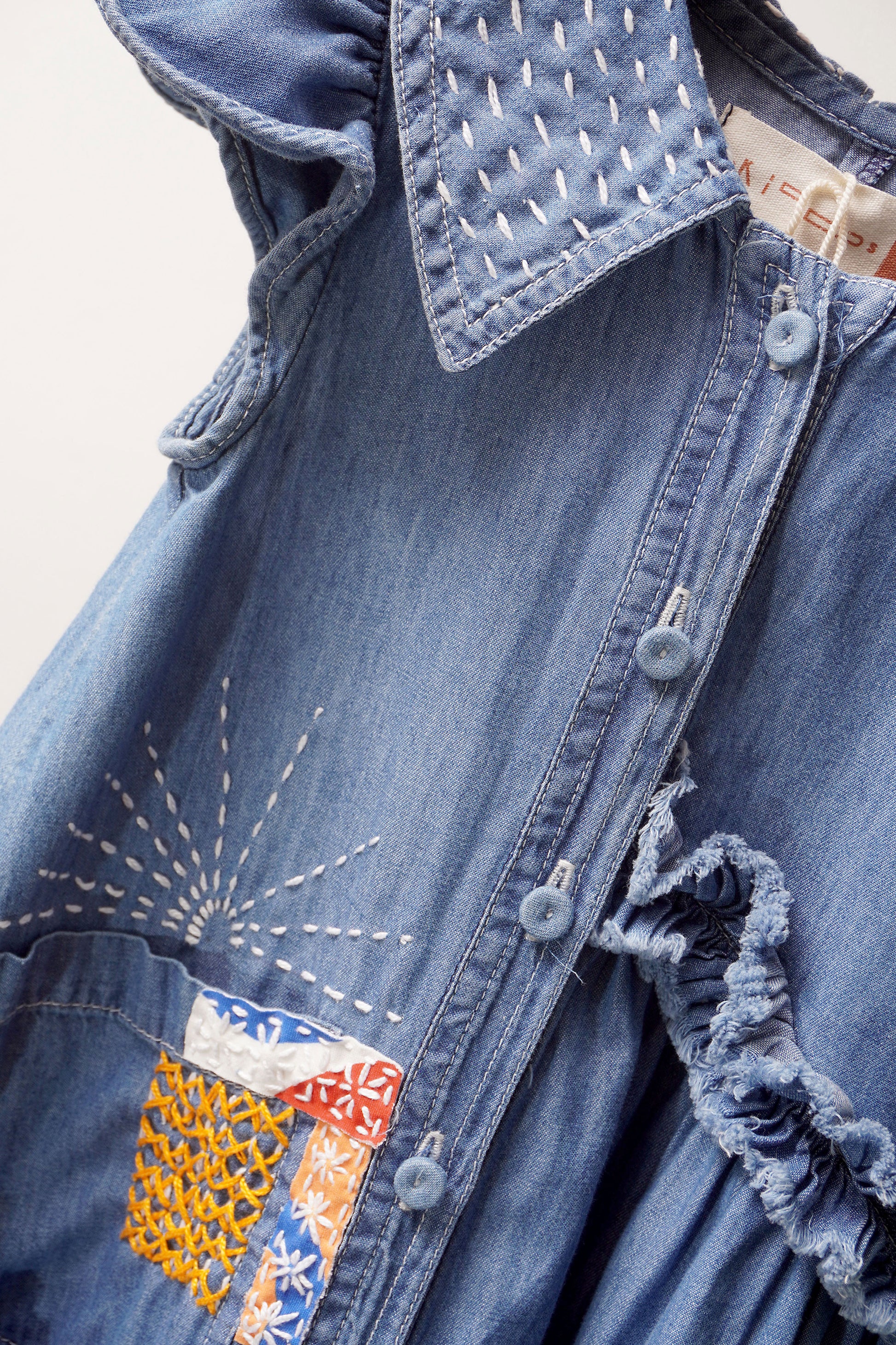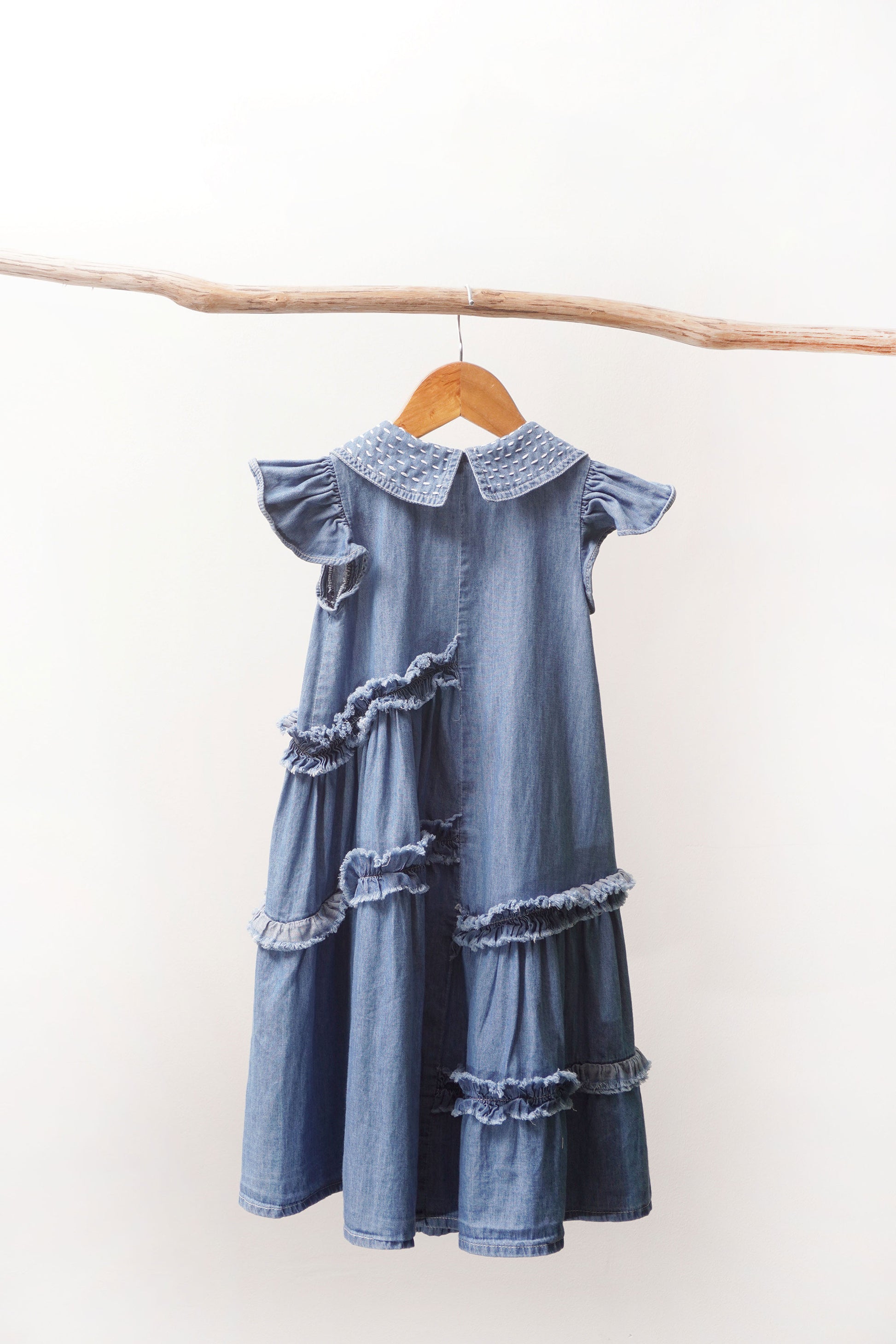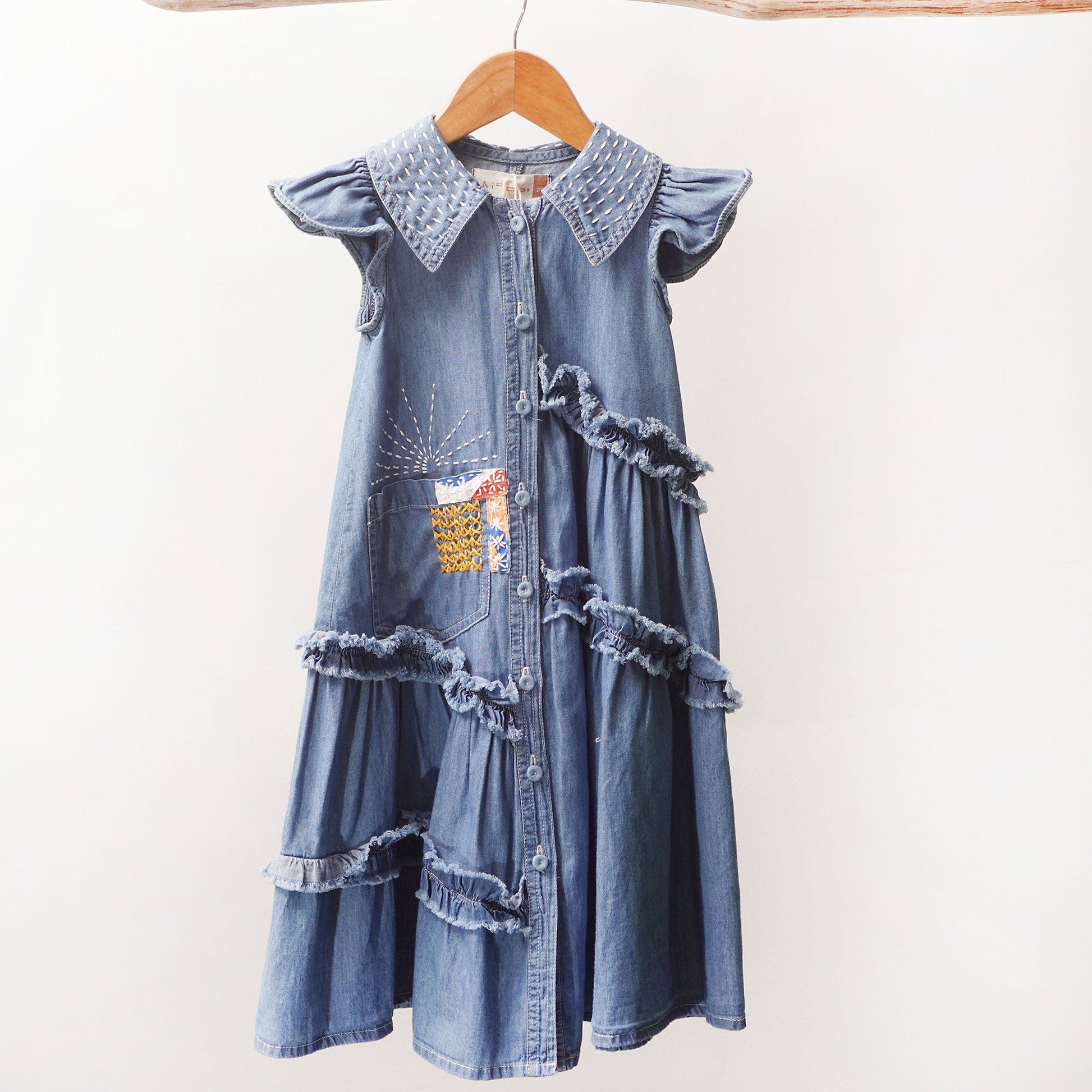 El encanto del oeste con nuestro Mary Ann Dress. Este vestido camisero largo, confeccionado en chambray 100% algodón, es perfecto para las pequeñas que quieren un look fresco y divertido. Con ruches en espiral, hombros ondulados y un cuello y bolsillo bordado a mano.