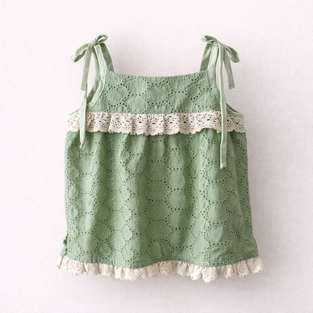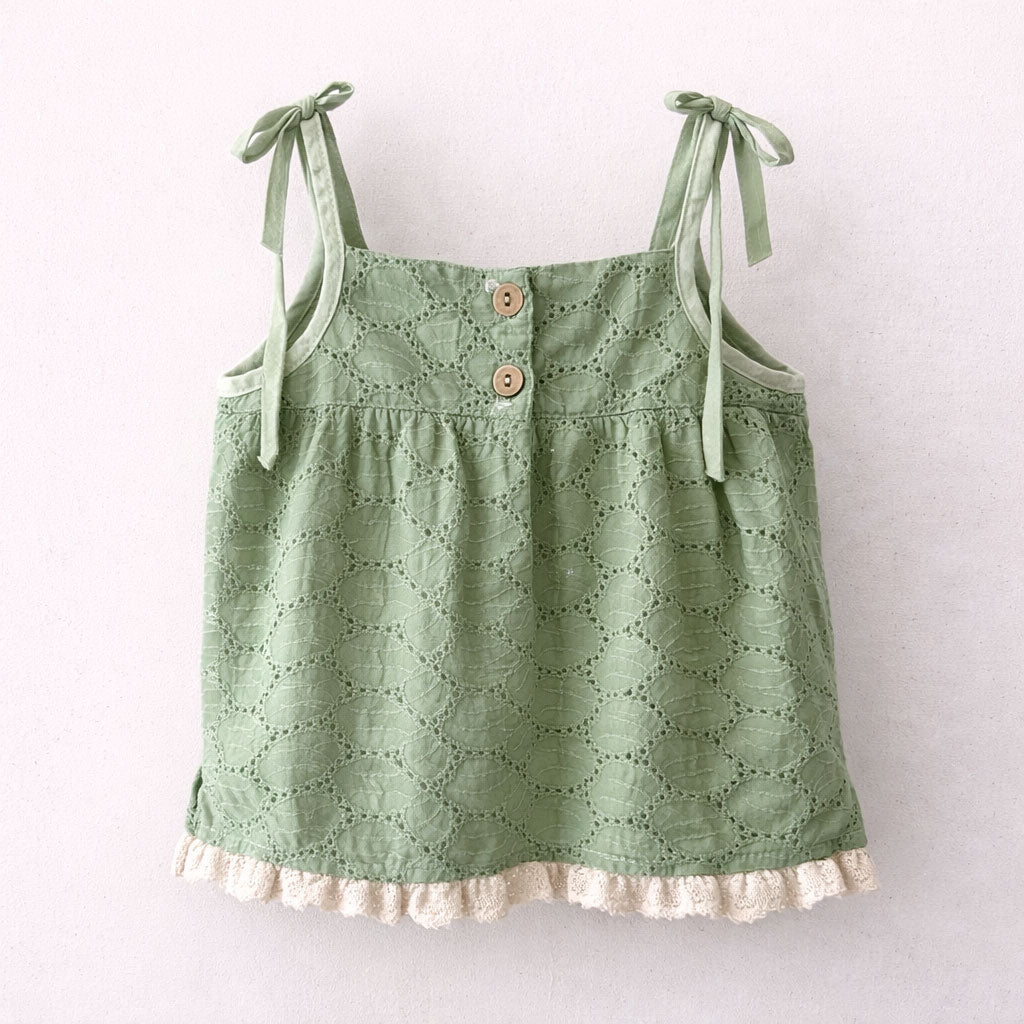 Crafted in green eyelet fabric, this top balances freshness with subtle artisanal detail. Lace at the chest and hem adds texture and softness, while the back button closure makes it easy to wear. A versatile piece designed for everyday life and special occasions