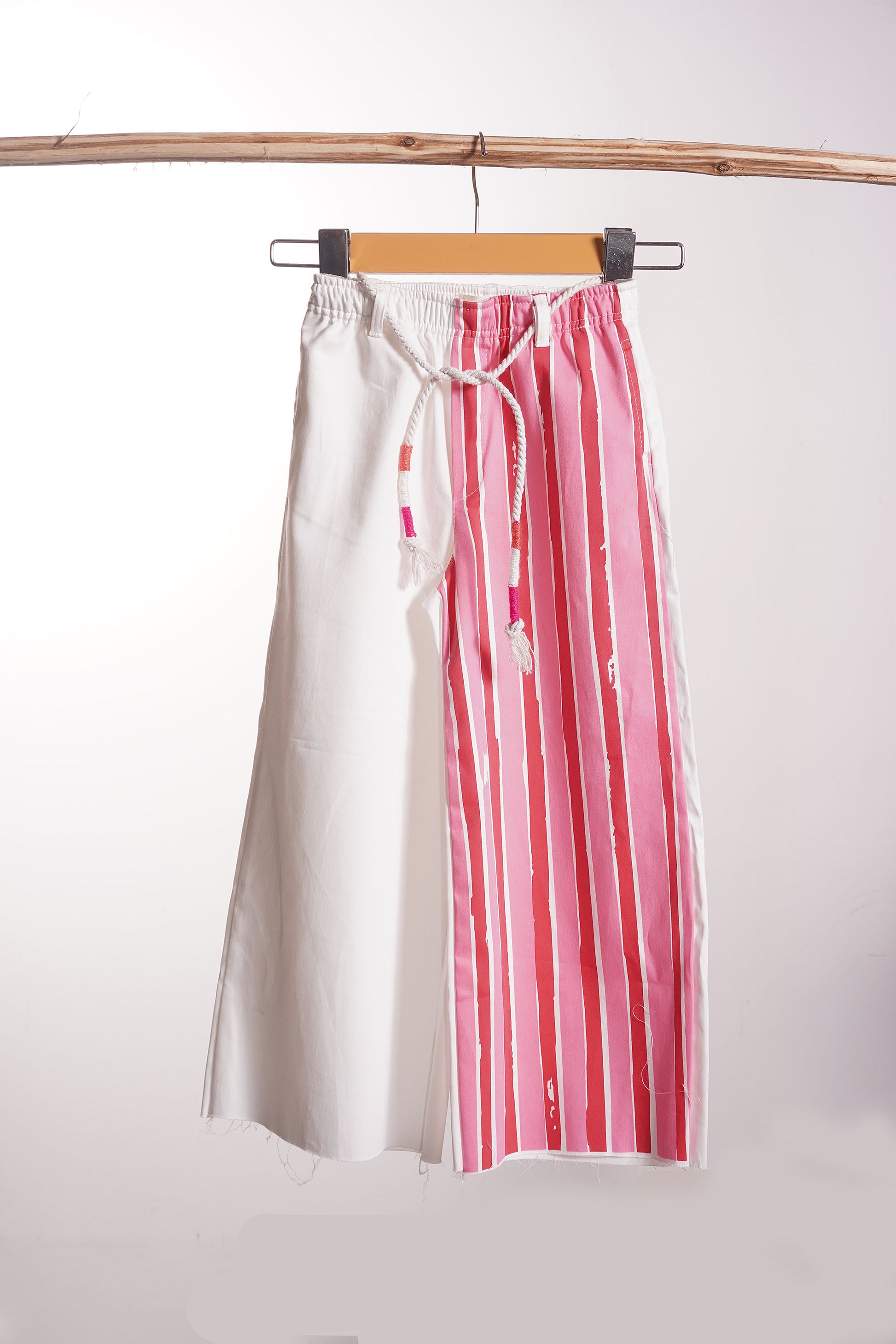 Striped fun with our pants! 🍬 A unique design with vibrant contrast: pure white on one side and playful pink stripes on the other, evoking outdoor games and sunny afternoons. Elastic waistband with braided cotton drawstring for a comfy and secure fit – perfect for freedom of movement. Made in soft, lightweight, and quick-drying fabric, ideal for the beach, strolls, and park adventures! A fresh and original piece for free-spirited and sweet girls."