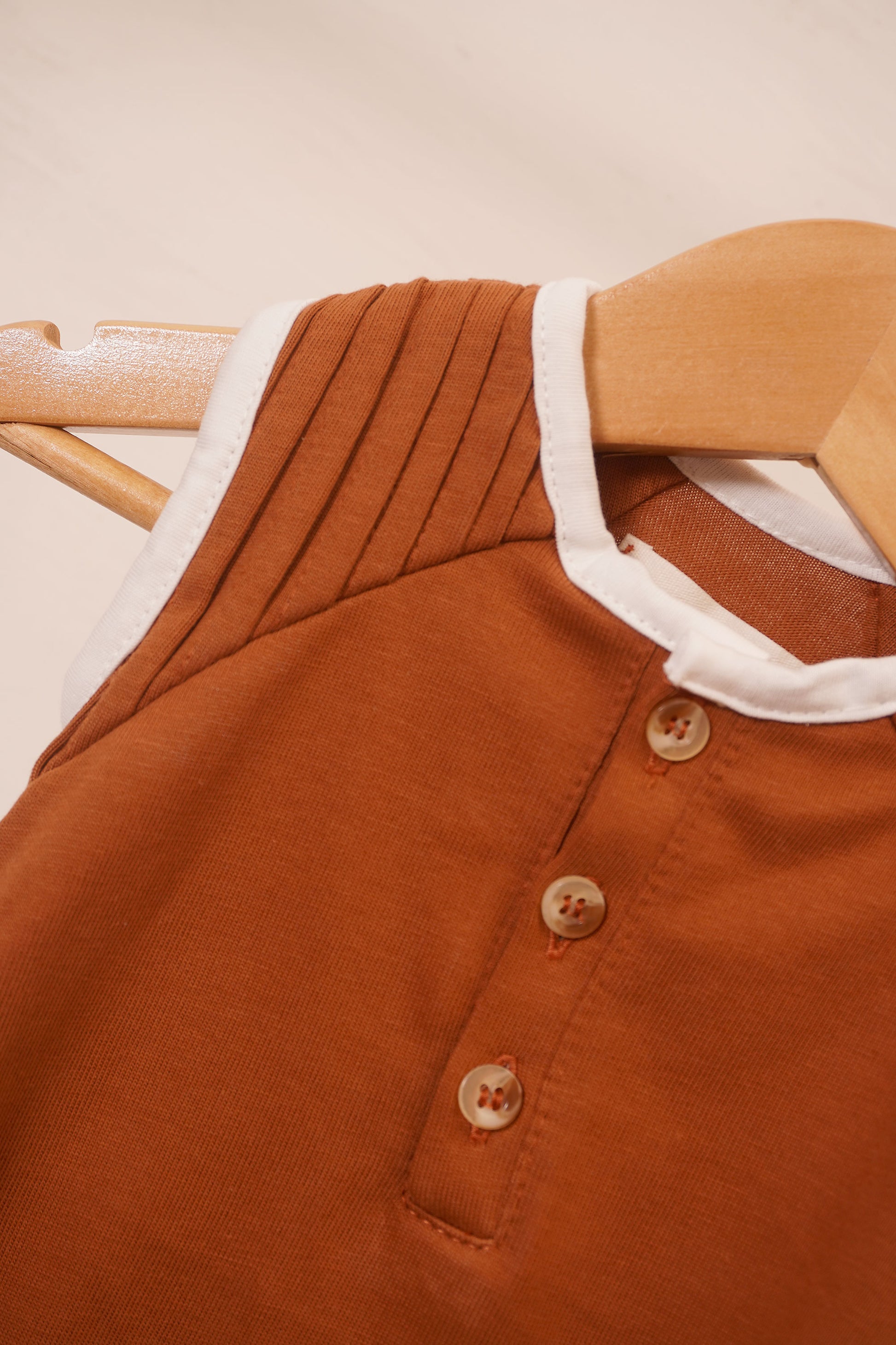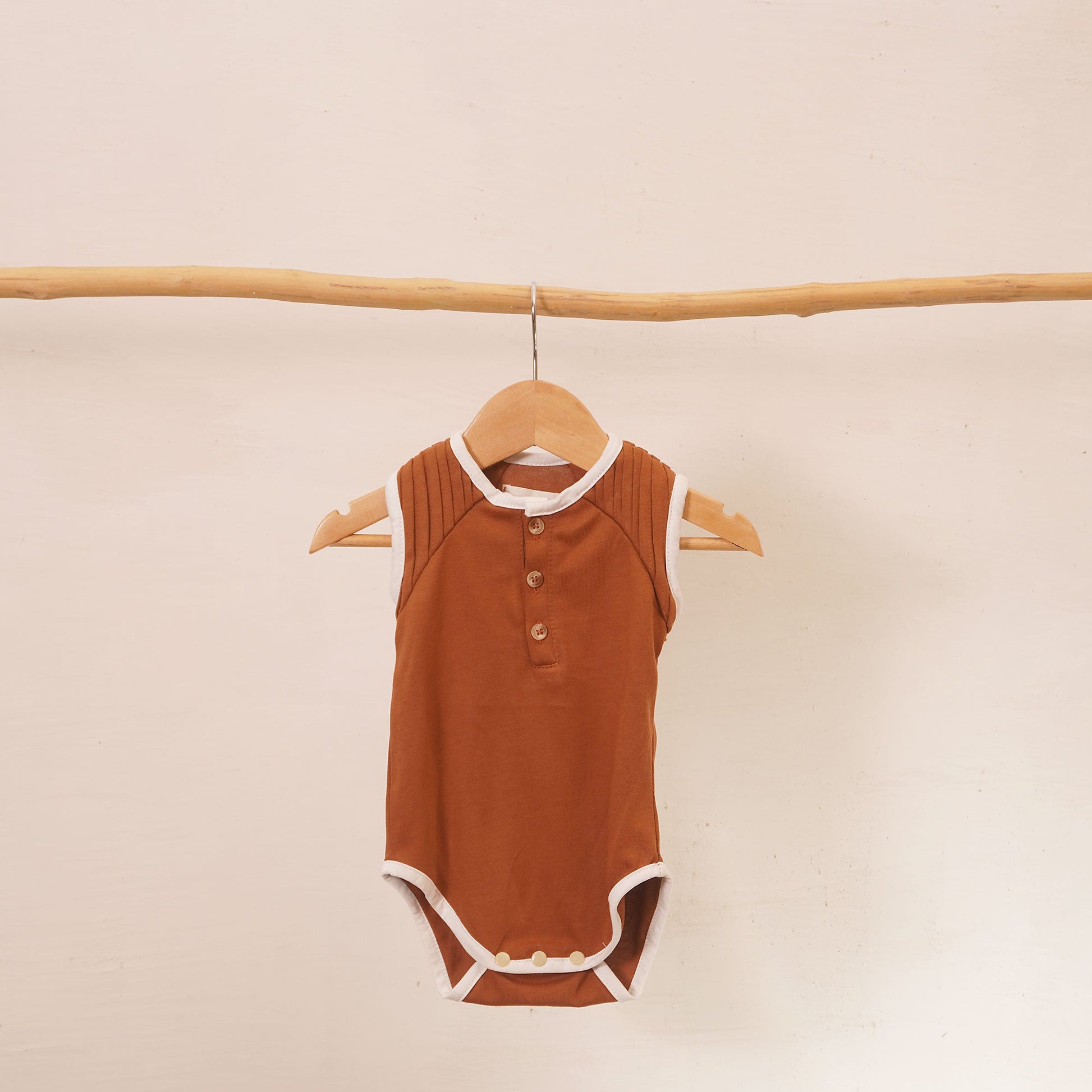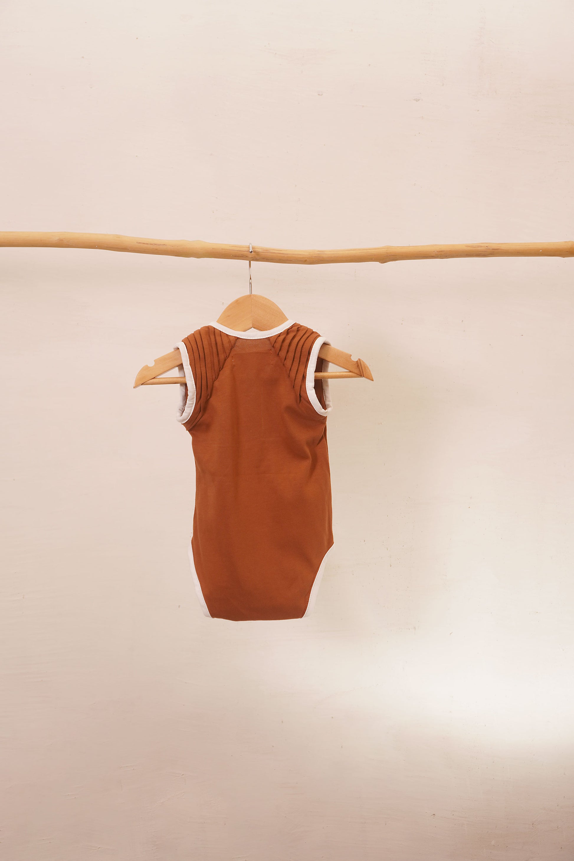 Confeccionado en suave algodón, este onesie sin mangas en un vibrante tono terracota es pura energía para pequeños aventureros. Sus orillos blancos le dan un toque deportivo y moderno, mientras que los pliegues en los hombros y los botones frontales aseguran comodidad con mucho estilo. ¡Suave, fresco y súper versátil para cada expedición diaria!