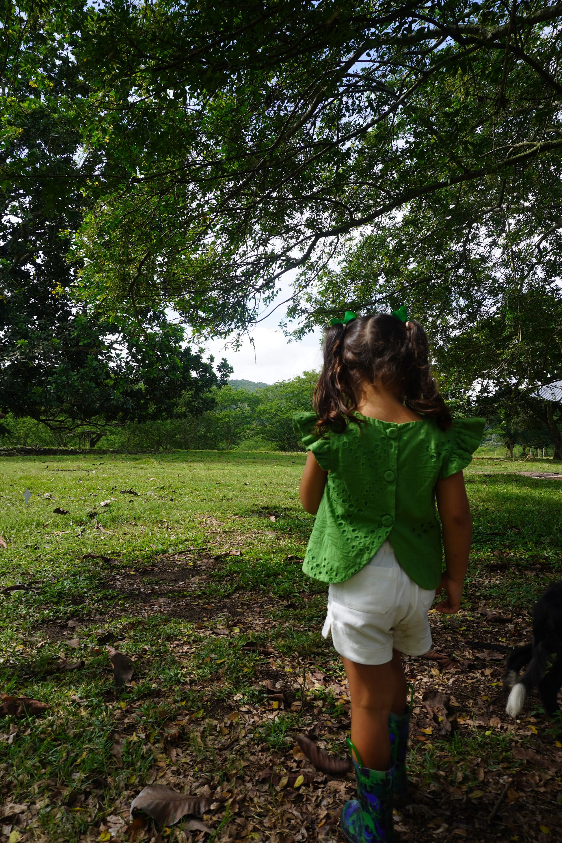 Confeccionada en suave algodón 100% con delicado ojalillo verde, esta blusa es una verdadera declaración de estilo. Sus mangas, inspiradas en los pétalos de una flor, le dan un toque romántico y encantador. La parte trasera, con su diseño especial y botones forrados de la misma tela, añade un detalle único. Combínala con shorts para un look divertido y casual, o con un pantalón para una ocasión especial. ¡Un diseño versátil para cualquier momento!