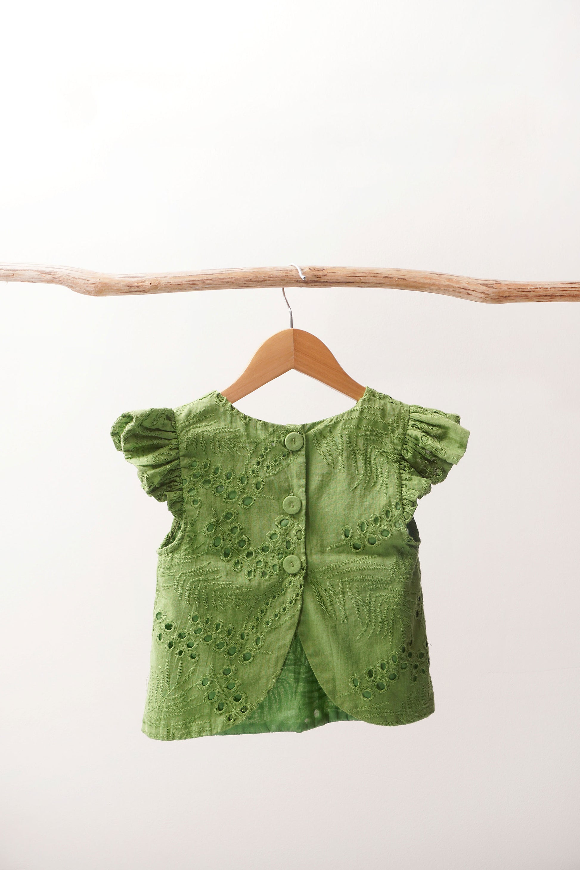 Made from soft 100% cotton with delicate green eyelet, this blouse is a true style statement. Its sleeves, inspired by flower petals, give it a romantic and charming touch. The back, with its special design and buttons covered in the same fabric, adds a unique detail. Pair it with shorts for a fun and casual look, or with pants for a special occasion. A versatile design for any moment!