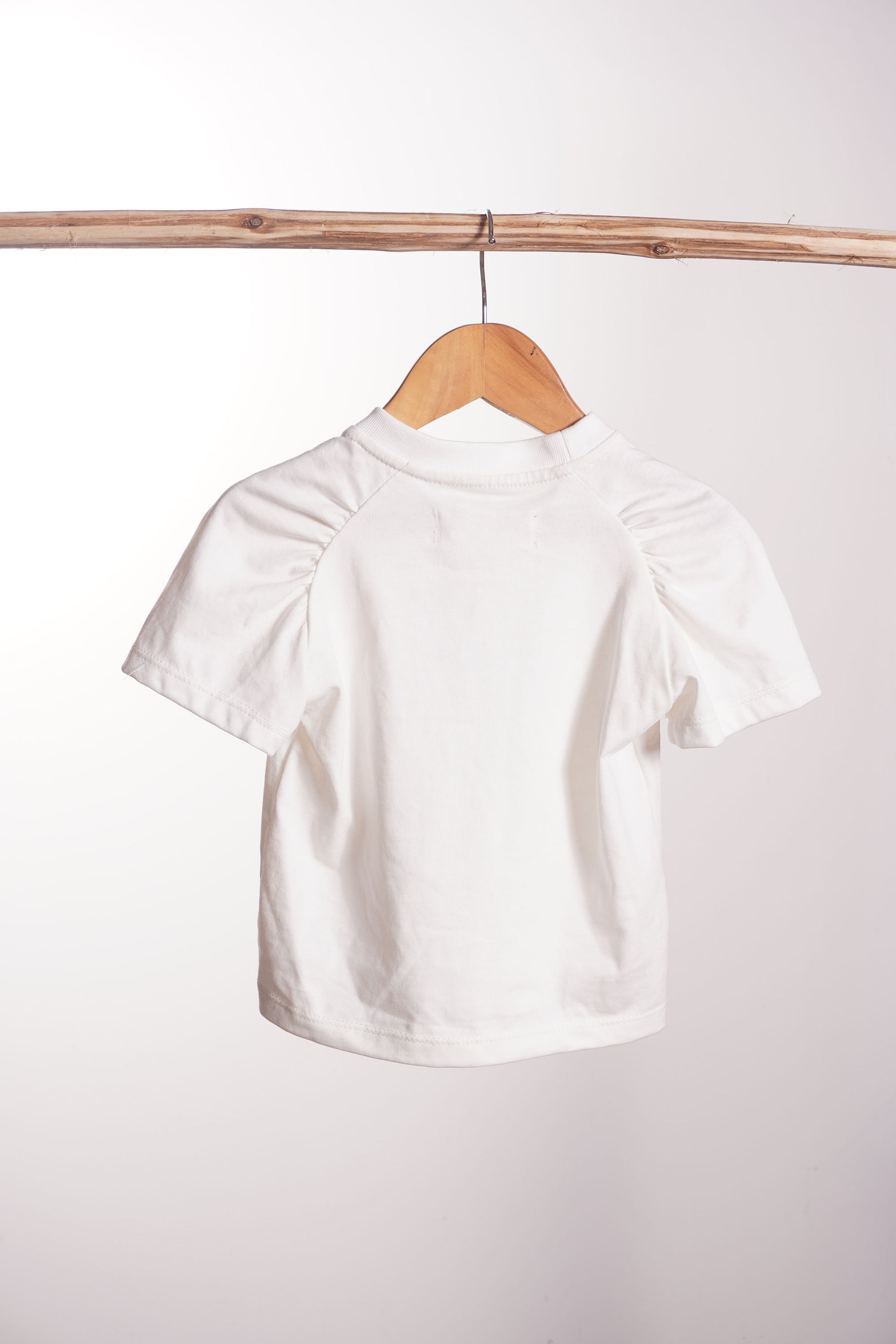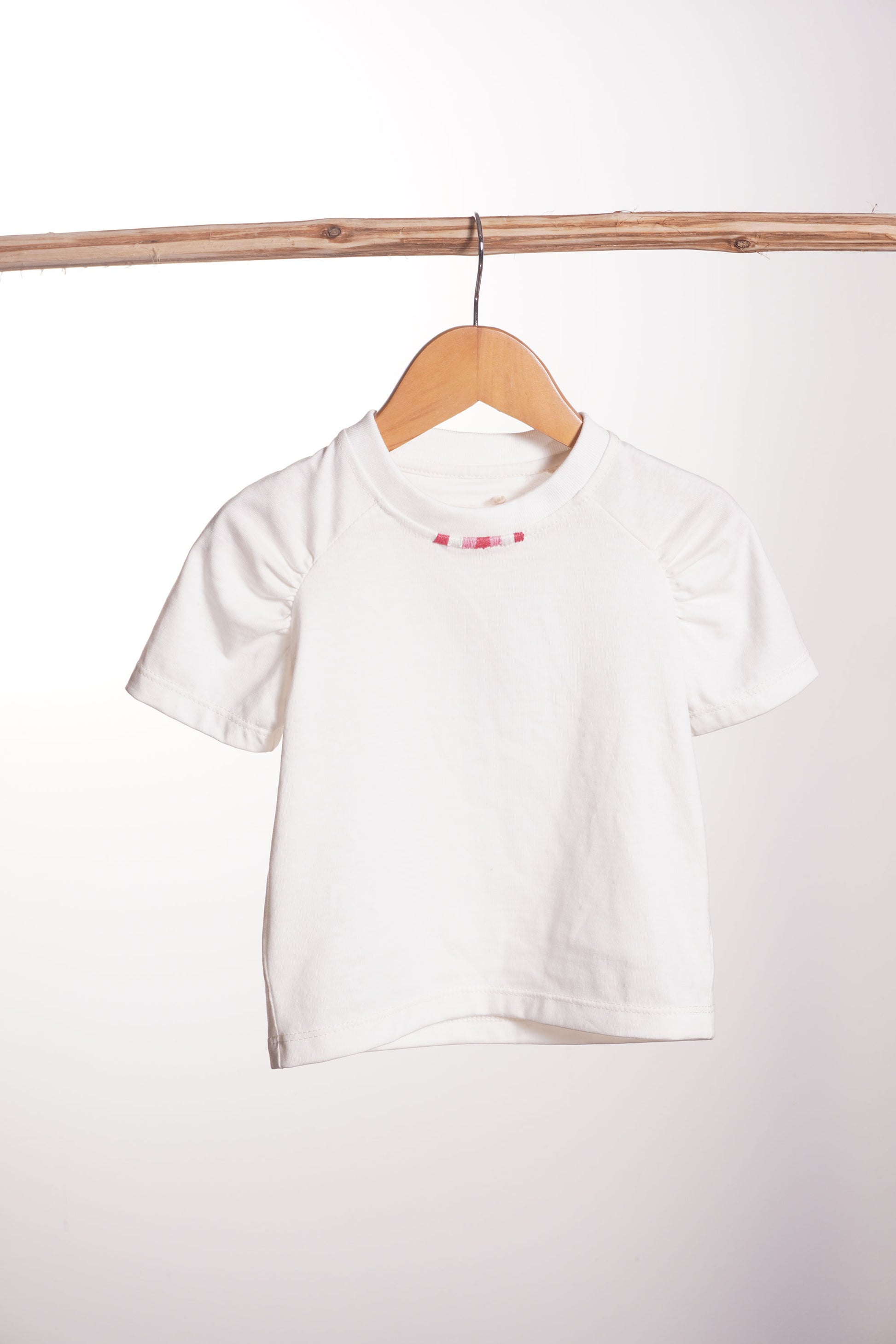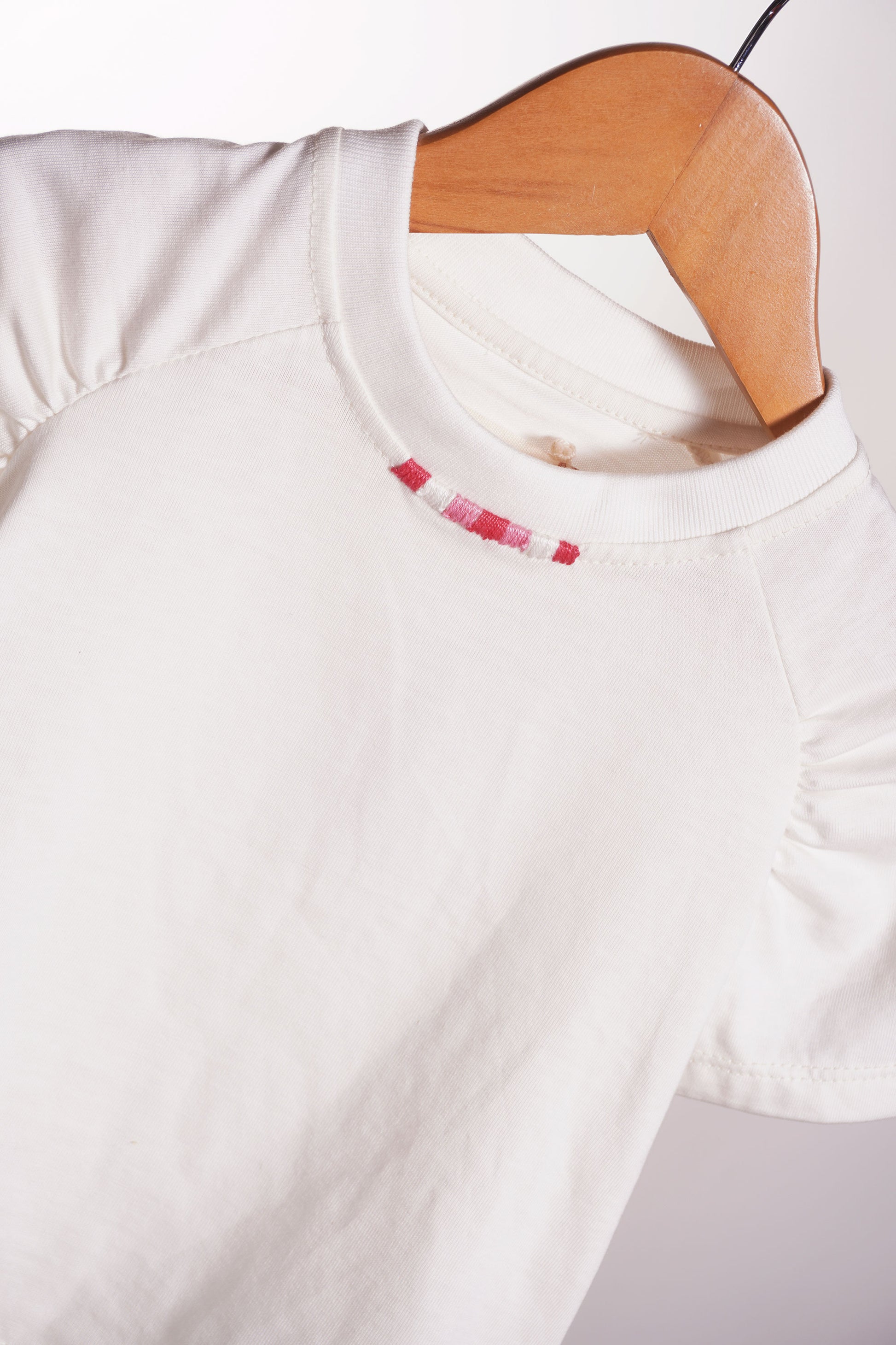 Básico suave y fresco para días divertidos. Fruncido delicado en mangas y bordado rosa a mano. ¡Un toque dulce y encantador que suma ternura a cualquier look!"
